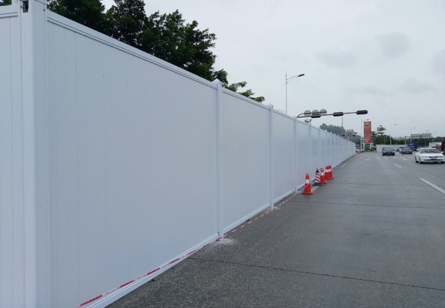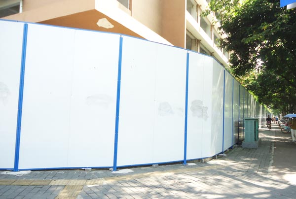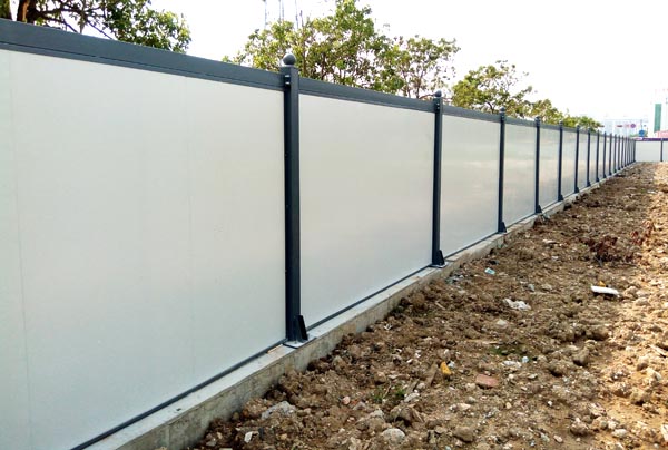 施工圍擋用白色彩鋼板作墻體,用藍(lán)色雙拼C型鋼作立柱,立柱頂部配藍(lán)色造型端蓋(可裝路燈),圍墻四周用藍(lán)色彩鋼框邊。高矮、大小、色澤一致。臟污后隨時(shí)可用水清洗擦拭。
